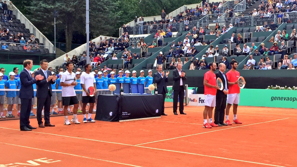 Le premier titre du Geneva Open 2015 a été remporté par Juan Sebastian Cabal et Robert Farah. Dans une finale du double serrée, les Colombiens sont venus à bout de la paire composée de Raven Klaasen (RSA) et Yen-Hsun Lu (TPE) dans le super tie-break. Score final: 7-5 4-6 10-7. Ils ont reçu leurs trophées des mains du maire de Genève Sami Kanaan.